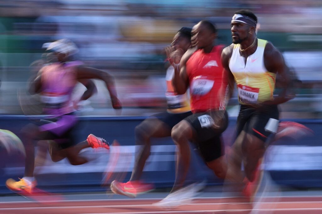 Medtem je v moški konkurenci dvakratni olimpijski podprvak na 200 m Kenny Bednarek prevladoval in zmagal z 9,79 sekunde pred Courtneyem Lindseyem, ki je bil drugi z 9,82 sekunde, tretjim T’Marsom McCallumom s časom 9,83, vsi trije so tekli osebne rekorde, četrti je bil Trayvon Bromell z 9,84.