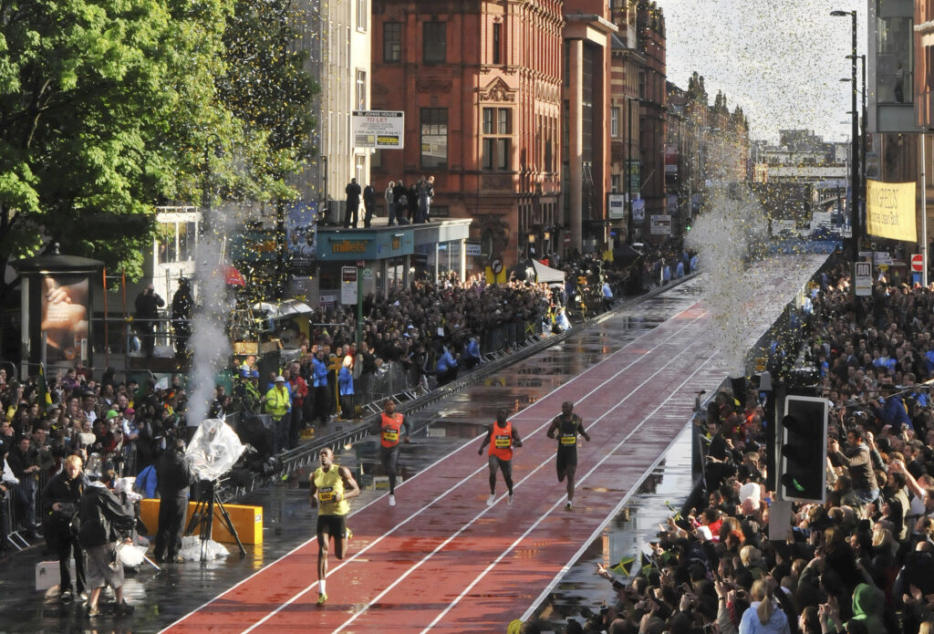 Maja 2009 je Bolt na ulicah Manchestra 150 metrov po ravni liniji pretekel v času 14,35 in krepko popravil mejnik legendarnega Britanca Linforda Christieja, ki je leta 1994 tekel 14,97.