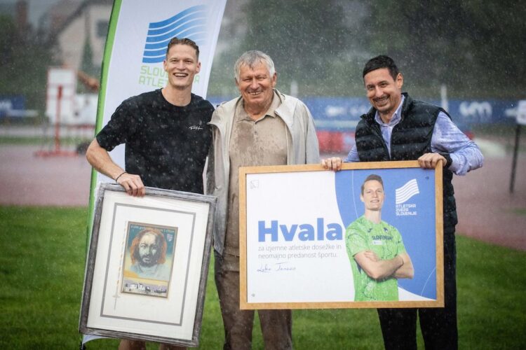Zlato medaljo je okoli vratu obesil svojemu nasledniku Roku Ferlanu, takoj zatem pa je iz rok direktorja Atletske zveze Slovenije Nejca Jeraše prejel simbolično plaketo, medtem ko mu je predsednik celjskega Kladivarja Stane Rozman poklonil umetniško sliko.