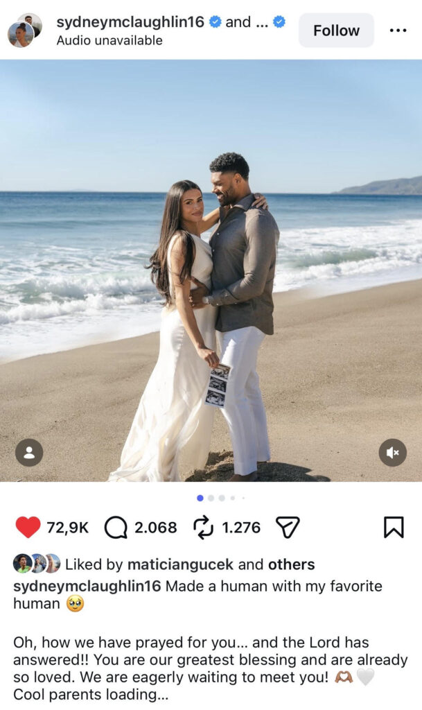 “Oh, kako dolgo sva molila zate … in Gospod naju je uslišal!! Si najin največji blagoslov in že zdaj si tako zelo ljubljen(a). Komaj čakava, da te spoznava! Kul starša prihajava …” je na Instagramu, kjer ima 1,5 milijona sledilcev, veselo novico delila Sydney McLaughlin-Levrone, ki otroka pričakuje z možem Andrejem Levronejem Jr., nekdanjim igralcem ameriškega nogometa (NFL).