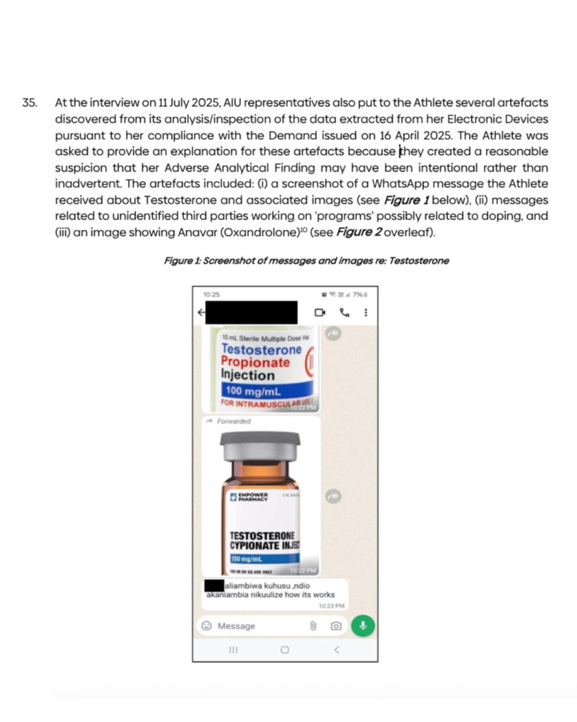 V aplikaciji WhatsApp so v njenem telefonu namreč našli več fotografij in tudi posnetkov zaslona stekleničk testosterona, pa tudi sporočila ljudi, ki so povezani z dopingom in dobavo nedovoljenih poživil. Sporočila so iz let 2022, 2023 in 2025.