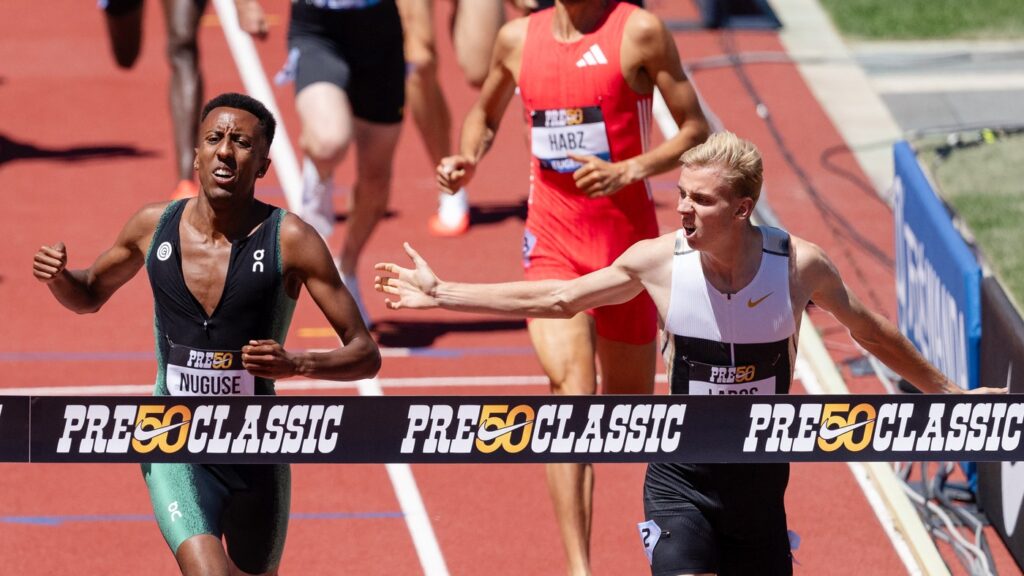 Podobno je bilo še 200 metrov pred koncem, ko se je Nuguse na prvem mestu malce oddaljil, potem pa je z neverjetnim finišem iz ozadja po notranji stezi na prvo mesto priletel Niels Laros, ki je slovitega Američana na koncu prehitel za pičlo stotinko in – to lahko zapišemo že zdaj – poskrbel za enega najbolj spektakularnih tekaških trenutkov leta 2025.