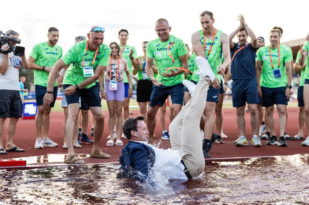 Atleti in trenerji so ga po koncu tekmovanja vrgli v bazen. FOTO: Jure Banfi.