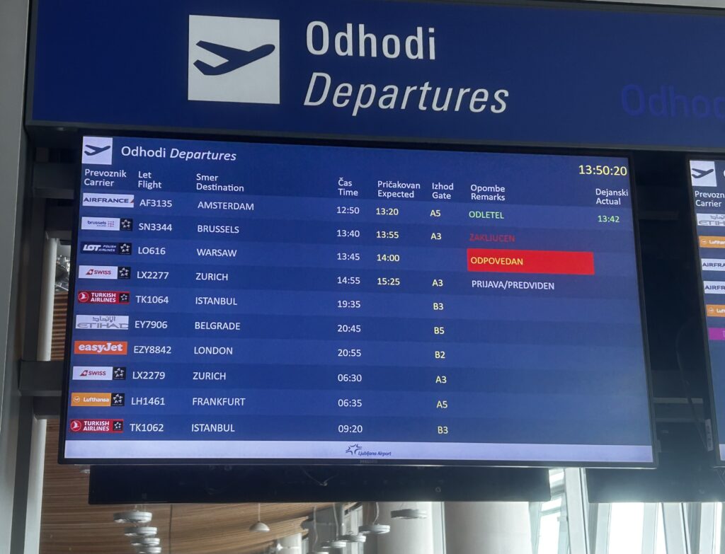 Po približno uri čakanja smo dočakali potrditev težav, ko se je na informacijskem zaslonu ob letu Ljubljana–Varšava izpisal napis “odpovedano”. Pozneje smo izvedeli, da zaradi vremenskih težav in premočnega vetra.