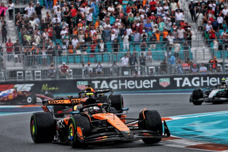 Lando Norris danes z veliko mero sreče do zmage na sprintu, ki mu bo v boju za svetovni naslov dobro dela. Vse se je razpletlo v 14. in 15. krogu. Sprva mokra steza v Miamiju se je hitro sušila, val menjav je sprožil Lewis Hamilton, ki se je s hitrejšimi pnevmatikami hitro začel prebijati naprej. To je povzročilo številčen odhod v garaže.