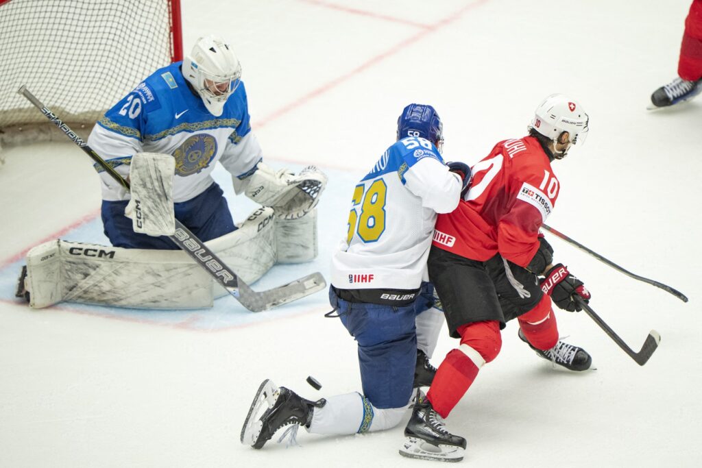 Kazahstan je povedel v 16. minuti po golu Arkadija Šestakova, pet sekund pred iztekom druge tretjine pa je izenačil Kevin Fiala. V zadnji tretjini so bili nato po vrsti natančni še Sven Andrighetto (48.), Andres Ambühl (58.) in Damien Riat (58.).