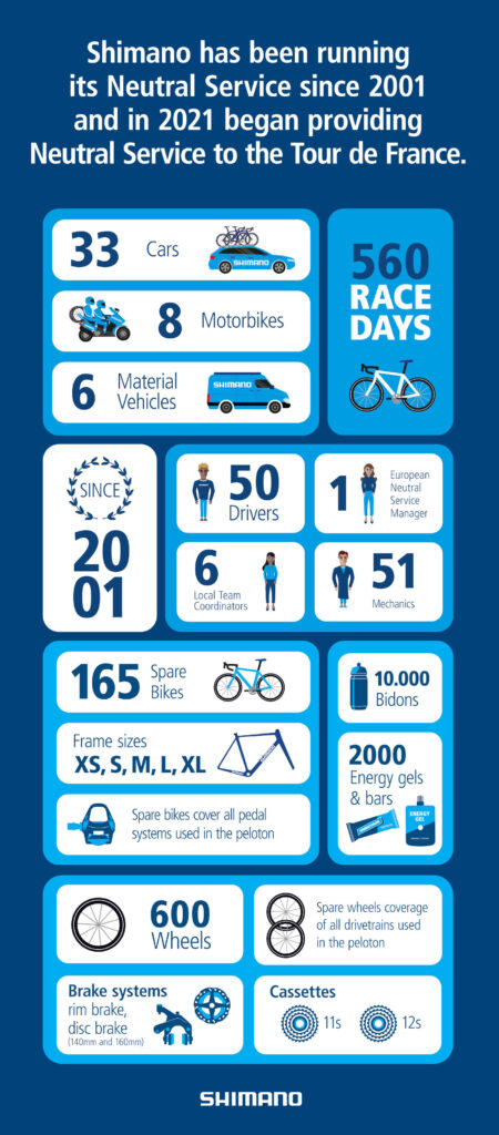 Kot je zapisano na njihovi spletni strani, mehaniki Shimana skrbijo za podporo kolesarjev s pomočjo avtomobilov in motorjev. Vsi imajo pri roki najbolj ključne sestavne dele koles, od verig, zavor in rezervnih obročev, ob sebi imajo tudi bidone in energijske gele ter ploščice. Njihovi avtomobili in kombiji pa spominjajo na prave premične delavnice. Čeprav je Shimano najbolj pogost proizvajalec vsega naštetega v karavani, pa imajo ob sebi tudi rezervne dele drugih znamk.