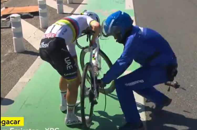 Po nesrečnem pripetljaju dobre tri kilometre pred ciljem, ko mu je kolesar Uno-X nespretno prečkal linijo, posledično pa je Tadej Pogačar izgubil nadzor nad kolesom in zdrsnil na tla, se je kot prvi ob njem znašel mož v modrem kombinezonu.