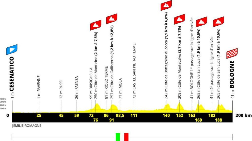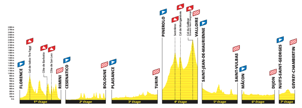 Če bo torej zgodovinsko na koncu, pa mora biti zgodovinsko tudi že na začetku, so očitno razmišljali Francozi. Dirka se bo še tretje leto zapored začela z gostovanjem v tuji državi. Po Danski in Španiji pa se bo tokrat sploh prvič v zgodovini začela v Italiji. Natančneje v Firencah, od koder se bodo kolesarji skozi San Marino odpravili do Riminija, kjer je zmagovalec Toura 1998 Marco Pantani umrl pred 25 leti. Razgibana in hribovita etapa bo že za začetek ponudila kar sedem kategoriziranih klancev in več kot 3600 višinskih metrov. Zaključek bo vendarle lažji, zadnjih 25 kilometrov bo šlo ob obali Jadranskega morja navzdol.