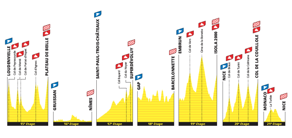 Zaključni teden bo odprla etapa za sprinterje, nato spet sledi pot proti Alpam. V 17. etapi v zadnjih 40 kilometrih trije zahtevni klanci: Bayard, Noyer in Superdevolouy, po tranzicijskem dnevu pa sledi res težak zaključek celotne dirke. V 19. etapi kar trije klanci nad 2000 metri, vključno z najvišjo cesto v Franciji – Bonette na kar 2802 metrih nadmorske višine -, cilj pa na Isoli 2000. Od tam pa le še pot do Nice in zaključna dneva ob Azurni obali, ki sta v podrobneje opisana zgoraj.