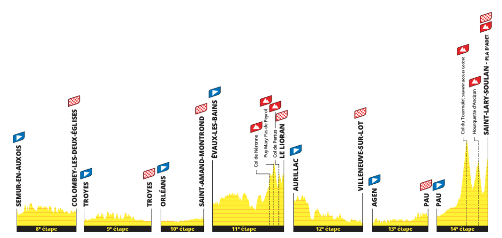 Drugi teden se bo začel z etapo, ki ponuja nevarnost vetra, nato pa peklenski dan od Evaux-les-Bainsa do Le Liorana, ko bo šla trasa cel dan gor in dol, kolesarji pa bodo opravili kar 4350 višinskih metrov. Po prihodu v Pireneje bo spet pestro v 14. in 15. etapi – v soboto najprej trojček vzponov Tourmalet, Hourquette Anzican in Pla d’Adet, v nedeljo pa še po višinskih metrih najtežji dan na Touru 2024. Peyresourde, Mente, Portet d’ Aspet, Agnes in Platue de Beille bodo zagotovo premešali vrstni red skupnega seštevka.