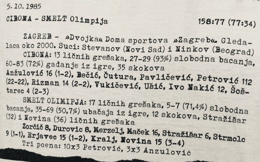 Takratna vzhajajoča zvezda hrvaške, jugoslovanske in evropske košarke Dražen Petrović, ki je le nekaj mesecev pred tem v Zagreb prinesel pokal za najboljšo evropsko ekipo, je tisto tekmo (158:77) ob strinjanju trenerja Željka Pavličevića in sodelovanju soigralcev izkoristil za podiranje strelskega rekorda. Želel je preseči 23 let star podvig pokojnega Radivoja Koraća (76 točk).