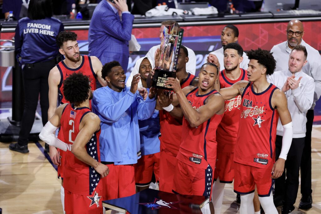 Ameriško ekipo zvezd so sestavljali Edwards, Maxey, Holmgren, Barnes, Duren, Jalen Johnson, Devin Booker in Cade Cunningham, v ekipi črt pa so bili Durant, Jaylen Brown, Jalen Brunson, De’Aaron Fox, Brandon Ingram, LeBron James, Donovan Mitchell in Leonard. Zaradi poškodbe je v civilni odpravi ob igrišču sedel Stephen Curry.