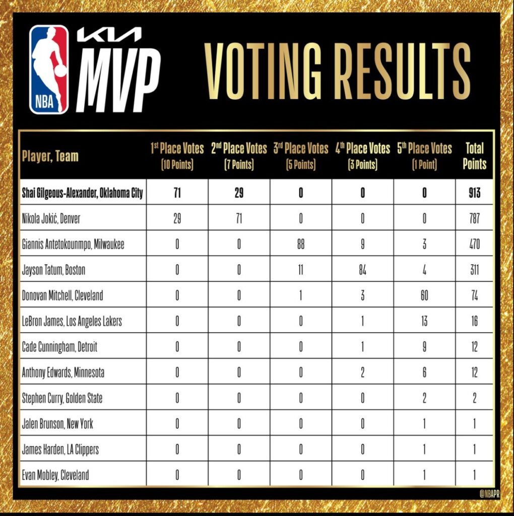 Kanadski reprezentant je skupno prejel 913 točk, 126 več od Nikole Jokića. Med stotimi novinarji, ki glasujejo za posamezne nagrade v ligi NBA, ga je kar 71 postavilo na prvo mesto. 29 je kot MVP-ja videlo Nikolo Jokića. Tretje mesto je zasedel Giannis Antetokounmpo s 470 točkami.