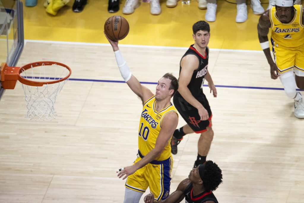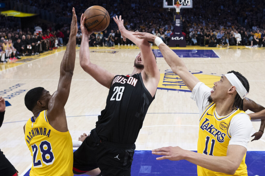 Košarkarji Los Angeles Lakers so na prvi tekmi četrtfinala končnice zahodnega dela severnoameriške lige NBA premagali Houston Rockets s 107:98. V dvoboju dveh oslabljenih zasedb, pri jezernikih sta manjkala Luka Dončić in Austin Reaves, pri raketah pa Kevin Durant, sta se ob zmagi najbolj izkazala Luke Kennard in LeBron James.