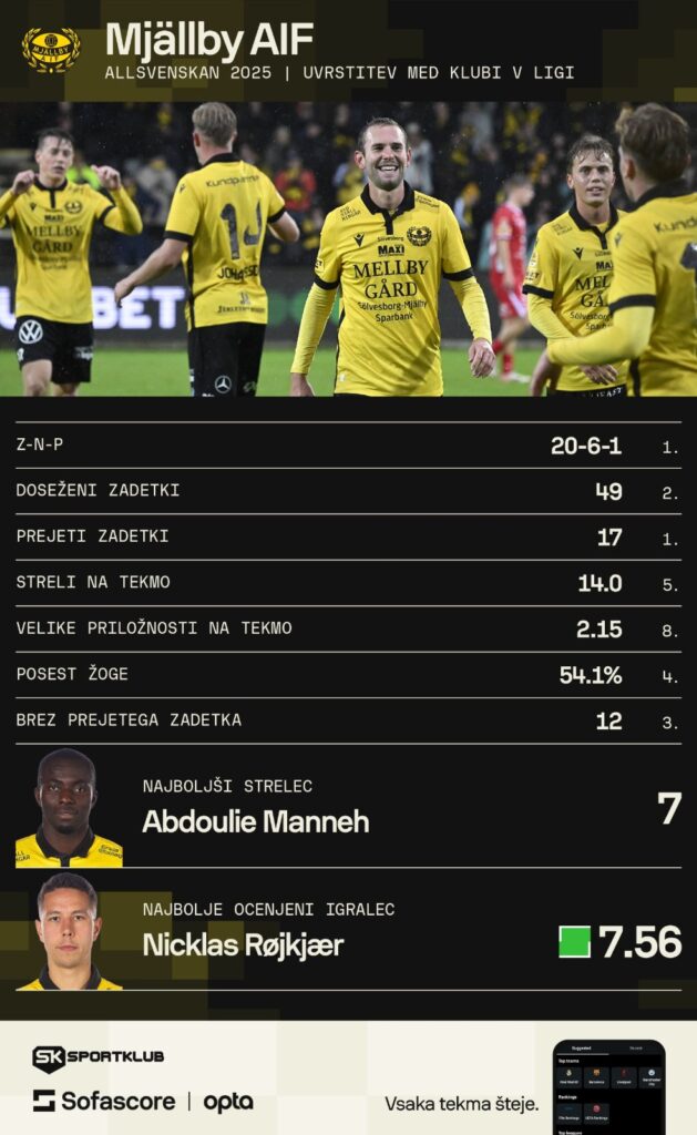 Še več, če Mjällby zmaga vsaj na eni od preostalih tekem ali pa dvakrat remizira, bo postavil nov prvenstveni rekord po številu osvojenih točk. Ta je sicer v rokah švedskega velikana Malmöja, ki je leta 2010 v 30 krogih zbral 67 točk, leta 2018 pa je njegov dosežek ponovil AIK.