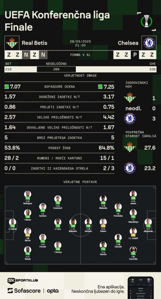 Nogometaši Real Betisa in Chelseaja se bodo drevi ob 21. uri v Vroclavu na Poljskem borili za naslov v konferenčni ligi. To bo četrti finale tretjerazrednega evropskega tekmovanja, v prvih treh so slavili Roma, West Ham in Olympiacos.