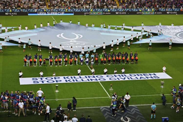Pred sredinim finalom evropskega superpokala med PSG in Tottenhamom je Uefa na igrišču razgrnila transparent z napisoma proti ubijanju otrok in civilistov. Dan pozneje na krovni evropski zvezi zatrjujejo, da ne gre za politično sporočilo.