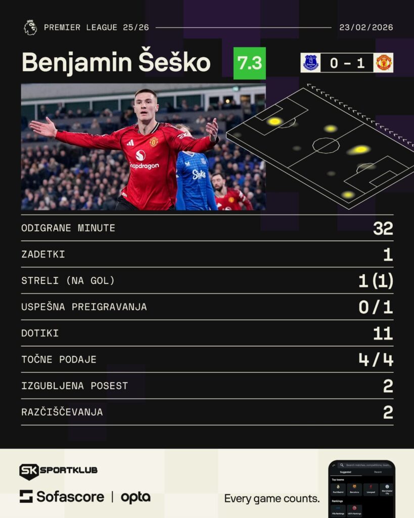 Benjamin Šeško je bil veliki junak ponedeljkovega obračuna v angleškem prvenstvu, na katerem je Manchester United prav po zaslugi Slovenčevega gola na gostovanju pri Evertonu zmagal z 1:0. Z Uspeh na stadionu Hill Dickinson je Unitedu na prvenstveni razpredelnici znova skočil na četrto mesto, obenem pa si zagotovil tri točke prednosti pred najbližjima zasledovalcema Chelseajem in Liverpoolom.