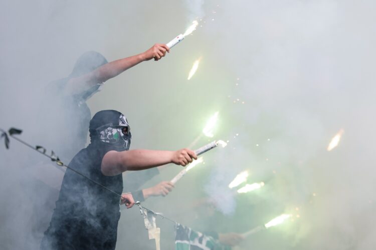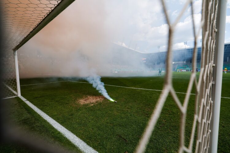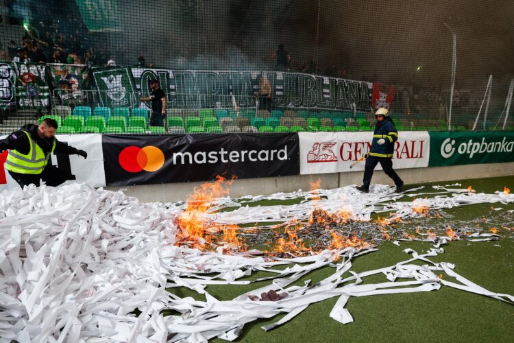 Začetek drugega dela so z nekajminutno prekinitvijo tekme začinili Green Dragons, ki so igrišče zasuli z belimi trakovi in slavnim napevom “umrl je Maribor”, le nekaj minut pozneje pa ni manjkal niti pirotehničen vložek, ki je Stožice ovil v gost oblak dima.