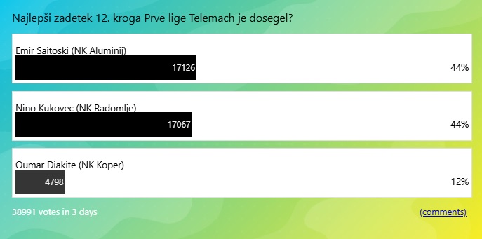 Za najlepši zadetek 12. kroga Prve lige Telemach ste izbrali zadetek člana Aluminija Emirja Saitoskega, ki je na koncu le za nekaj glasov premagal gol nogometaša Brava Nina Kukovca.