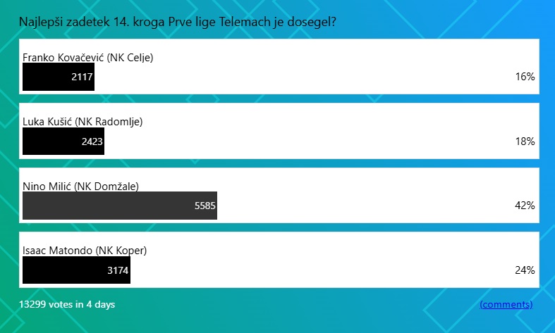 Za najlepši zadetek 14. kroga Prve lige Telemach ste izbrali neposredni zadetek iz kota člana Domžal Nina Milića.