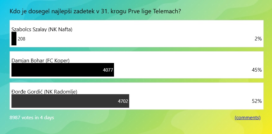 Po zaključku 31. kroga Prve lige Telemach je bilo na vrsti glasovanje za najlepši zadetek kroga. Tokrat so bili v ožjem izboru zadetki Szabolcsa Szalaya, Damjana Boharja in Đorđeja Gordića, zmagal pa je slednji.