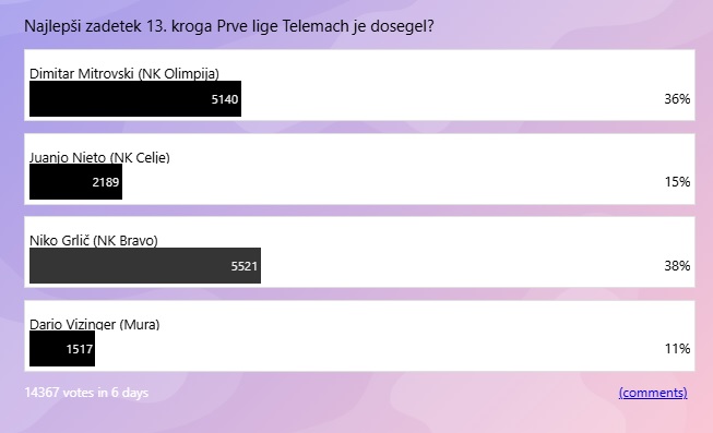 V 13. krogu Prve lige Telekom sta za najlepši zadetke kroga izbrali gol člana NK Bravo Nika Grliča, ki v Šiški igra kot posojen nogometaš Maribora.
