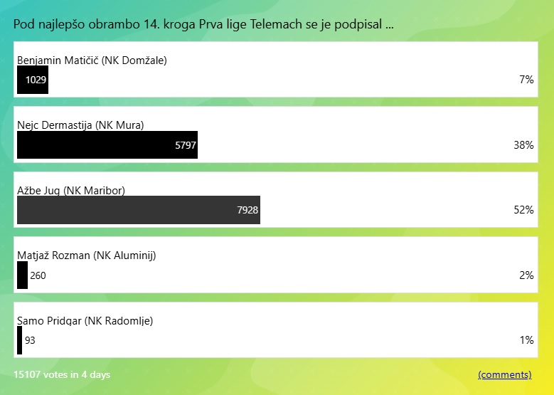 Po odigranem 14. krogu Prva lige Telemach je bilo znova na meniju glasovanje za najlepšo obrambo kroga. Na voljo ste meli šest sijajnih obramb, največ glasov pa je prejela obramba mariborskega čuvaja Ažbeta Juga.