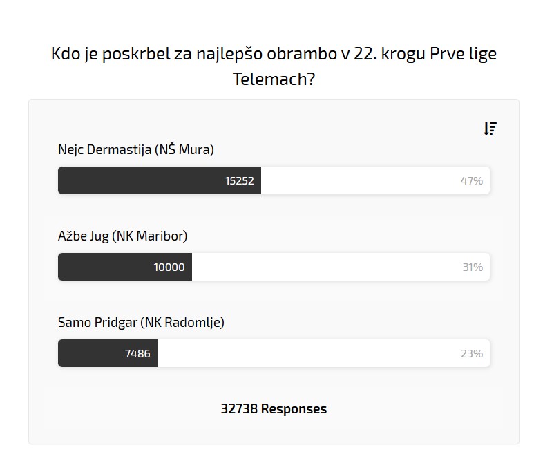 Po 22. krogu Prve lige Telemach so za najlepšo obrambo kroga kandidirali vratar Mure Nejc Dermastija, mariborska hobotnica Ažbe Jug in čuvaj mreže Radomelj Samo Pridgar. Odločitev je bila očitno lahka.
