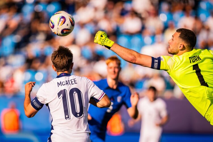 Deset minut kasneje so prvič resneje zapretili Angleži. Do žoge je prišel James McAtee, imel možnost za podajo v sredino kazenskega prostora, se odločil za strel, žoga ni našla cilja. Tudi v 29. minuti je naše mlade upe sreča “poljubila”, saj je Ethan Nwaneri zgrešil praktično prazen gol.