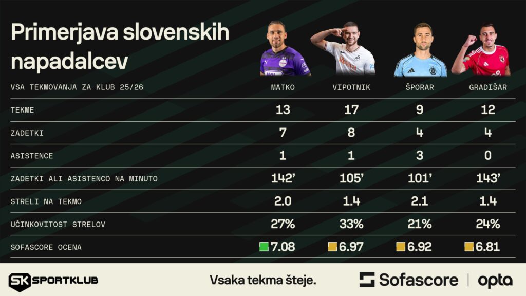 Slovenski napadalci so bili sicer v prvem delu kvalifikacij precej nerazpoloženi, a kar se tiče njihovih klubskih statusov, se določene stvari izboljšujejo. Tako selektorja Keka zagotovo veseli vrnitev Andraža Šporarja, ki je imel po selitvi k Slovanu iz Bratislave težave s poškodbo, te pa so zdaj preteklost in Ljubljančan je na zadnjih dveh prvenstvenih tekmah, ki ju je odigral v dresu najmočnejšega slovaškega kluba, prispeval kar štiri zadetke!