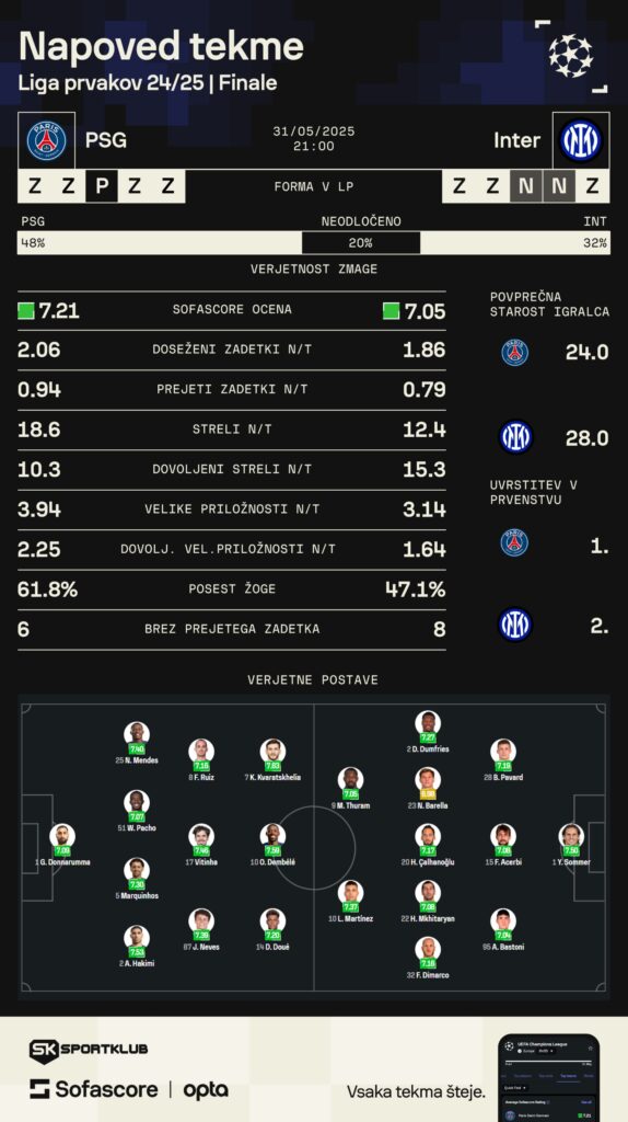 Tako Paris Saint-Germain kot Internazionale sta že nastopila v finalu v zadnjih petih letih, a oba zelenico zapuščala sklonjenih glav. Parižani so leta 2020 klonili v Lizboni proti Bayernu. Inter, sicer trikratni zmagovalec najelitnejšega evropskega klubskega tekmovanja, je pod vodstvom Simoneja Inzaghija igral že v finalu pred dvema letoma, ko je bil z 1:0 boljši Manchester City.
