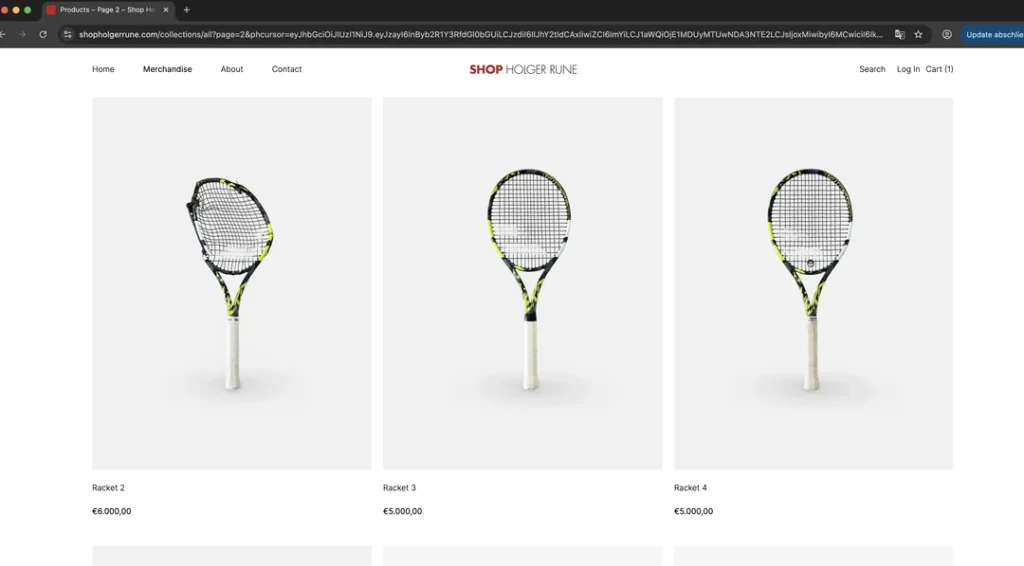Na spletni strani Holgerja Runeja lahko njegovi oboževalci kupijo marsikaj: drese s podpisom, podpisane plakate, čepice, karte … in tudi polomljene loparje.