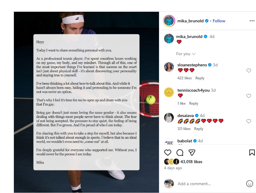Za zelo pogumno potezo se je pred dnevi odločil švicarski teniški igralec Mika Brunold. 21-letnik iz Winterthurja je v zapisu na družbenem omrežju Instagram priznal, da je istospolno usmerjen.