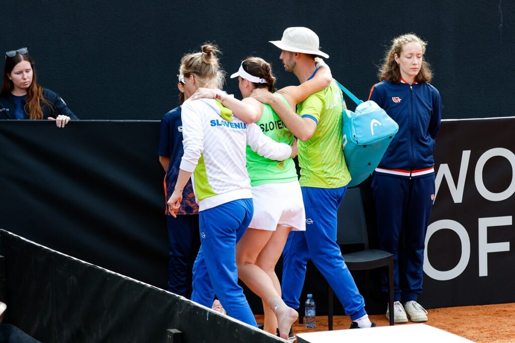 Na začetku tretjega niza prvega dvoboja kvalifikacij za zaključni turnir pokala Billie Jean King med Slovenijo in Španijo je gledalcem v Portorožu zastal niz. Domača junakinja Tamara Zidanšek si je namreč hudo zvila gleženj in bila primorana dvoboj proti Kaitlin Quevedo predati.