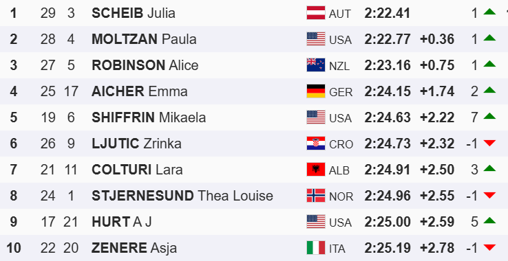 Za Nemko Emmo Aicher je bila na petem mestu Michaela Shiffrin iz ZDA. Slednja je tako ohranila skupno vodstvo v pokalu, ima 120 točk prednosti pred Aicher, Rast na tretjem mestu zaostaja za 223 točk.