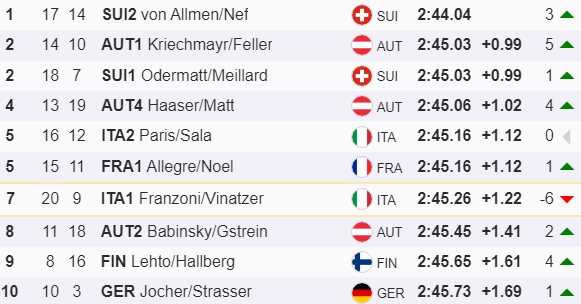 Švicarja Franjo Von Allmen in Tanguy Nef sta postala prva olimpijska prvaka v kombinaciji dvojic. Drugo mesto sta si razdelila še dva Švicarja Marco Odermatt in Loic Miellard ter Avstrijca Vincent Kriechmayer in Manuel Feller. Slovencev ni bilo na startu.