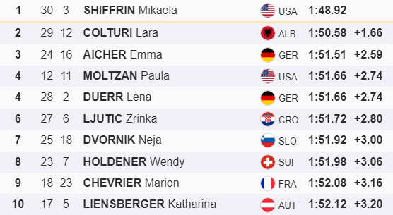 Tretje mesto je osvojil Nemka Emma Aicher, ki pa je za zmagovalko zaostala že za dve sekundi in 59 stotink.