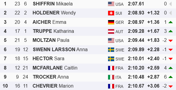 V zgodovini svetovnega pokala v alpskem smučanju je le Avstrijka Annemarie Moser-Pröll šestkrat osvojila skupni naslov (1971, 1972, 1973, 1974, 1975, 1979). Shiffrin je že predčasno postala zmagovalka slalomskega seštevka, devetič v karieri. Shiffrin je na desetih slalomih v tej sezoni zbrala 980 točk. Njena prednost pred Camille Rast znaša velikanskih 442 točk.
