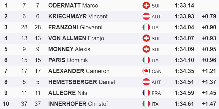 To ni zmedlo Marca Odermatta, ki je s fantastično vožnjo prišel do nove zmage, četrte zaporedne smukaške v Wengnu. Za 79 stotink sekunde je ugnal Avstrijca VIncenta Kriechamyrja, tretje mesto pa je zasedla italijanska senzacija Giovanni Franzoni z zaostankom devetih desetink sekunde.