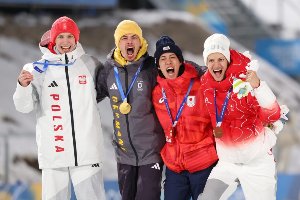 Zmagovalni oder sta dopolnila še dva tekmovalca, ki sta si delila tretje mesto – Ren Nikaido, ki je bronu s svetovnega prvenstva v poletih dodal olimpijskega. In Švicar Gregor Deschwanden, edini od omenjene četverice, rojen še v prejšnjem stoletju.