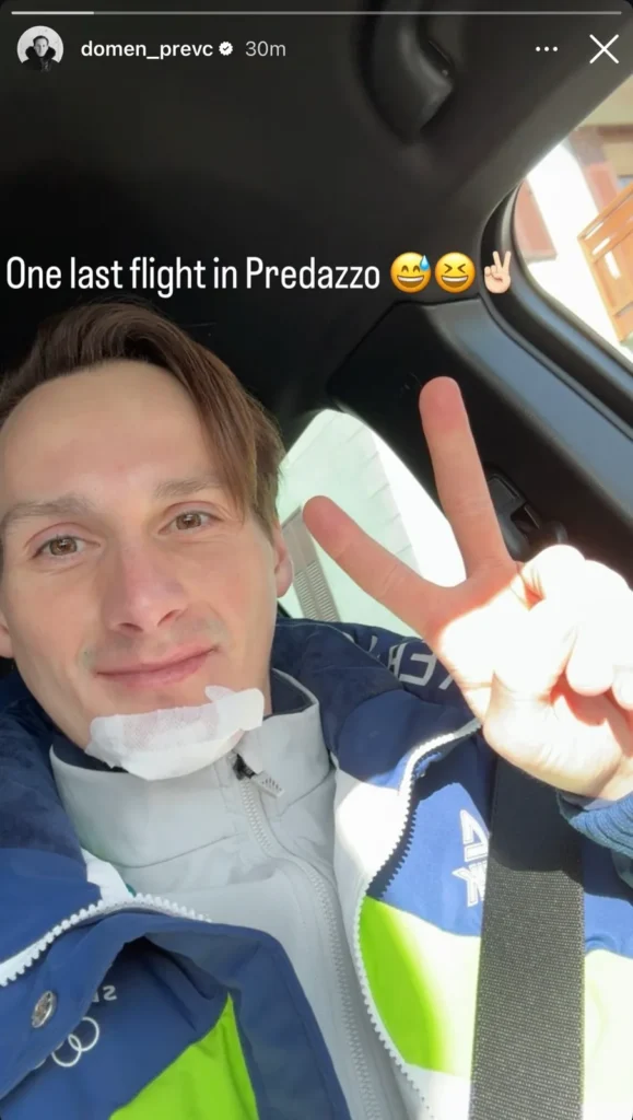 Da si Prevc tekmovanja pod petimi krogi ne bo zapomnil le po izjemnih uspehih, pa je tik pred odhodom iz Predazza poskrbela manjša nezgoda, ki se je primerila 26-letniku, saj je padel in si presekal brado.
