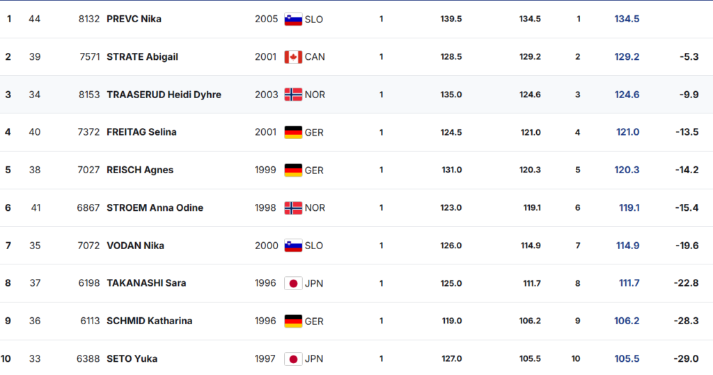 Dvajsetletna Nika Prevc je s 139,5 m dosegla 134,5 točke in bila 5,3 točke pred Kanadčanko Abigail Strate (128,5 m, 129,2 točke), ki je v soboto prav tako končala na drugem mestu. Tretja je bila tokrat Norvežanka Heidi Dyhre Traaserud s 135 m in 124,6 točke.