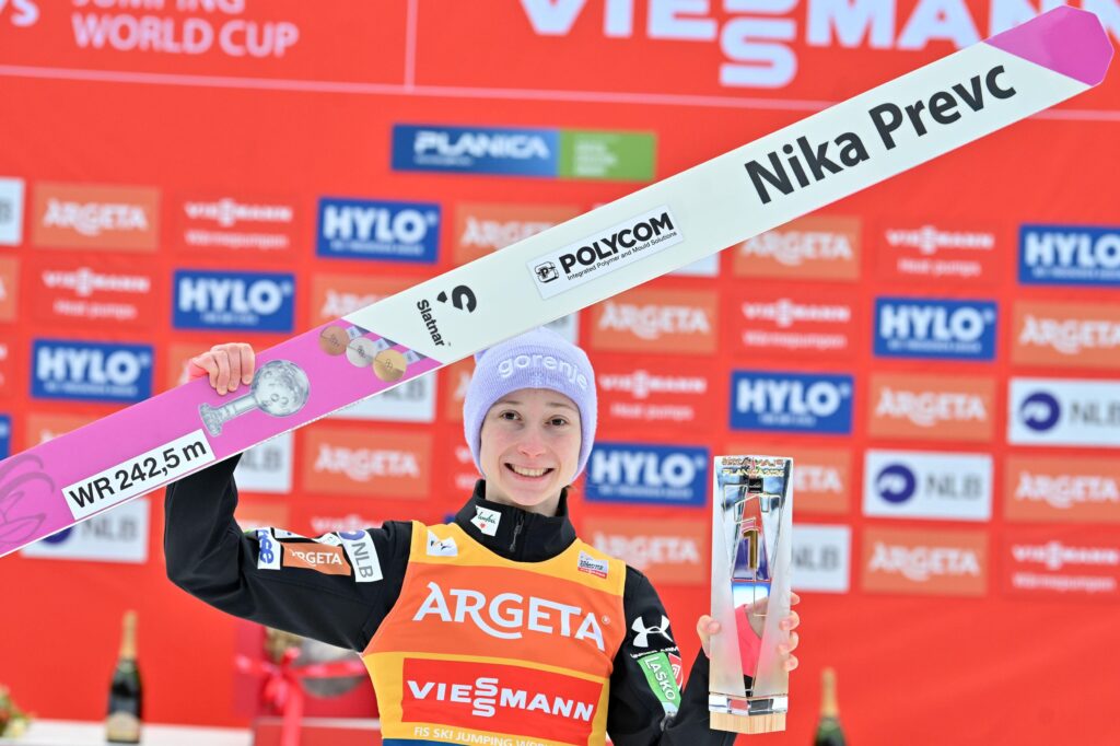 Za Niko Prevc je popoln konec tedna. Ne le da se je v soboto na premierni preizkušnji smučarskih skakalk na letalnici bratov Gorišek razveselila že svoje jubilejne 40. zmage v karieri, za nameček se od Planice poslavlja tudi z novim svetovnim rekordom(242,5 m) in že tretjim velikim kristalnim globusom. Njene neverjetne dosežke je s posebnim parom smuči obeležil tudi njen dolgoletni opremljevalec Peter Slatnar.