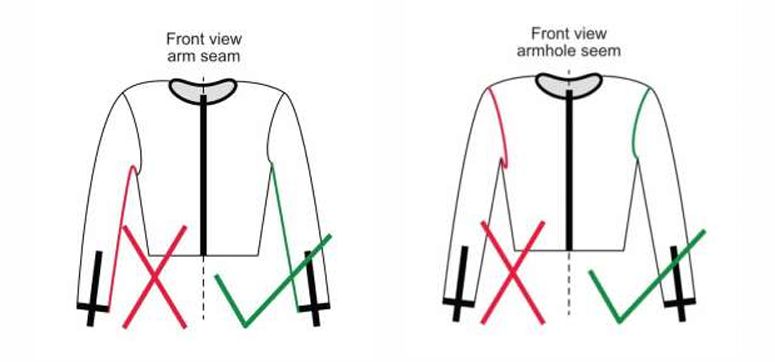 Toleranca se zmanjšuje proti pasnemu in kolenskemu šivu, ki se mora do pasnega šiva zmanjšati na nič. Povečava je dovoljena samo na sprednjem delu.- Konec šiva rokava prečka odprtino za roko in mora biti najvišja točka šiva rokava.