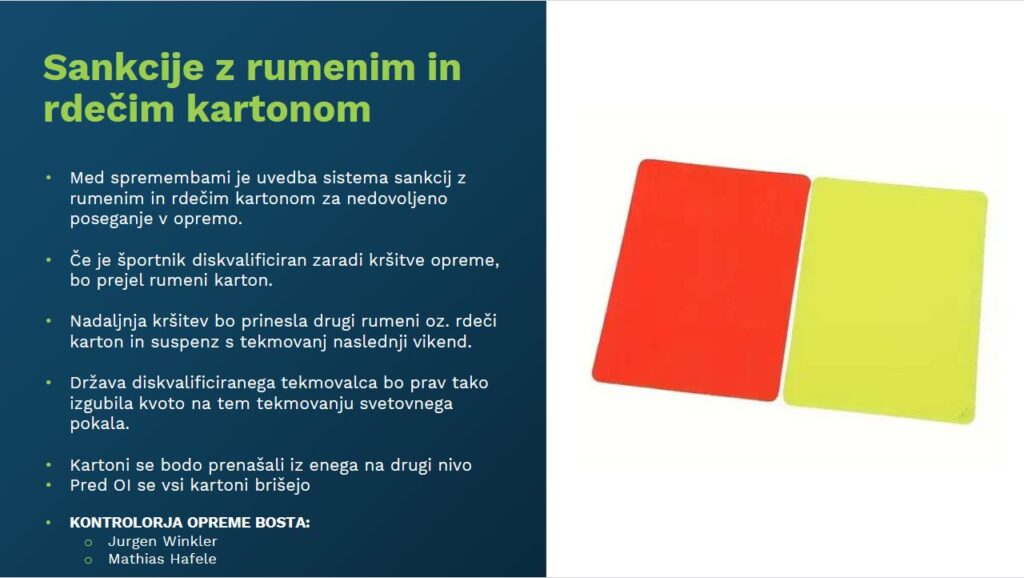 Novost, ki bo laični javnosti bržkone najbolj zanimiva, je uvedba rumenih in rdečih kartonov. Prva kršitev oziroma prva diskvalifikacija zaradi neprimerne opreme bo tekmovalcu po nogometnem vzoru prinesla rumeni karton in diskvalifikacijo na tekmi, vsaka ponovna kršitev pa bo pomenila drugi rumeni karton oziroma rdeči karton.